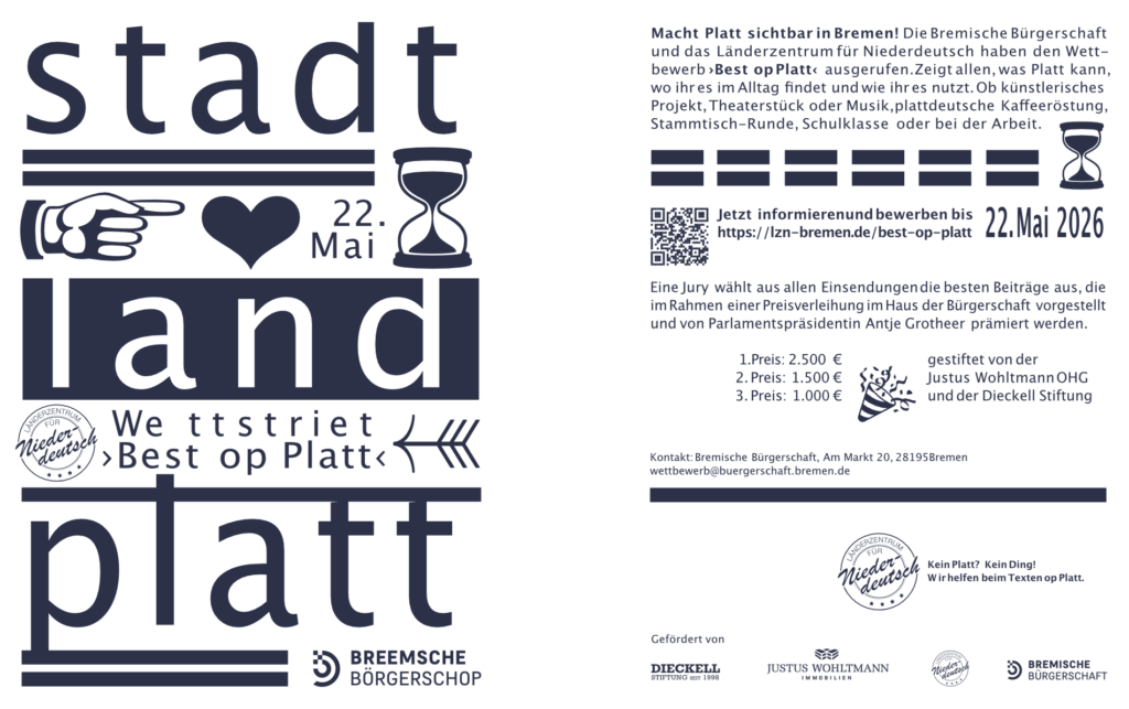 Plattdeutsch gehört zu unserer Kultur und zu uns. Dennoch verschwindet Plattdeutsch zunehmend aus dem Alltag. Die Bremische Bürgerschaft und das Länderzentrum für Niederdeutsch haben deshalb den Wettbewerb „best op Platt“ ausgerufen.