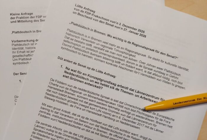 Plattdüütsch is in Bremen veel mehr as en Regionalspraak. Dat seggt ok de Senat. In en Anter op en Anfraag vun de Breemsche FDP-Frakschoon verkloort de Senat nu, woans sik Bremen för dat Plattdüütsche insett. […]